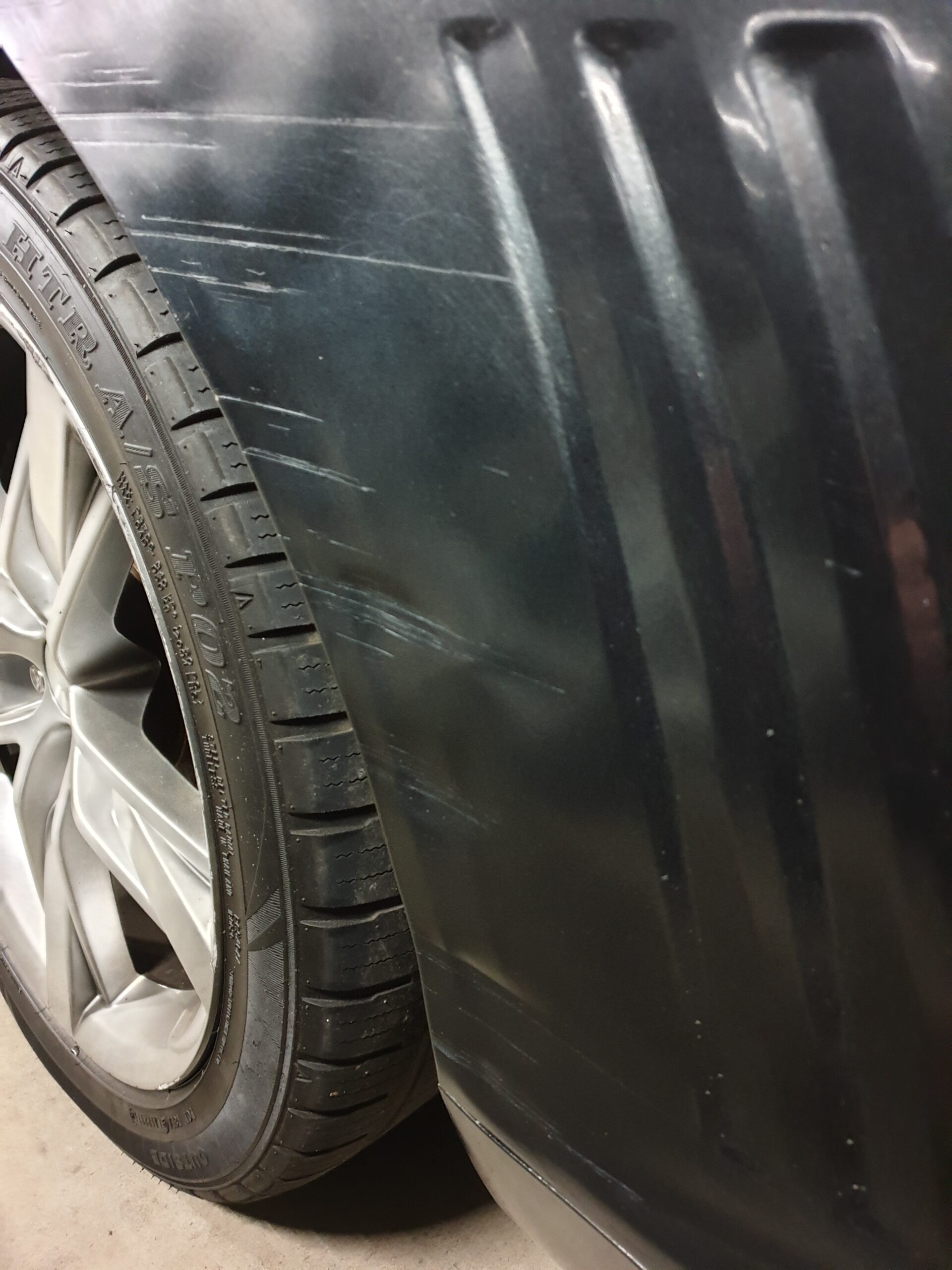Höger bakflygel hade fått sig en rejält smäll med repor och bucklor som resultat. Förutom motorn skulle detta bli största jobbet på bilen. Höger framdörr hade tidigare ägare lackerat om med färgrinningar som följt och såg ganska bedrövlig ut.