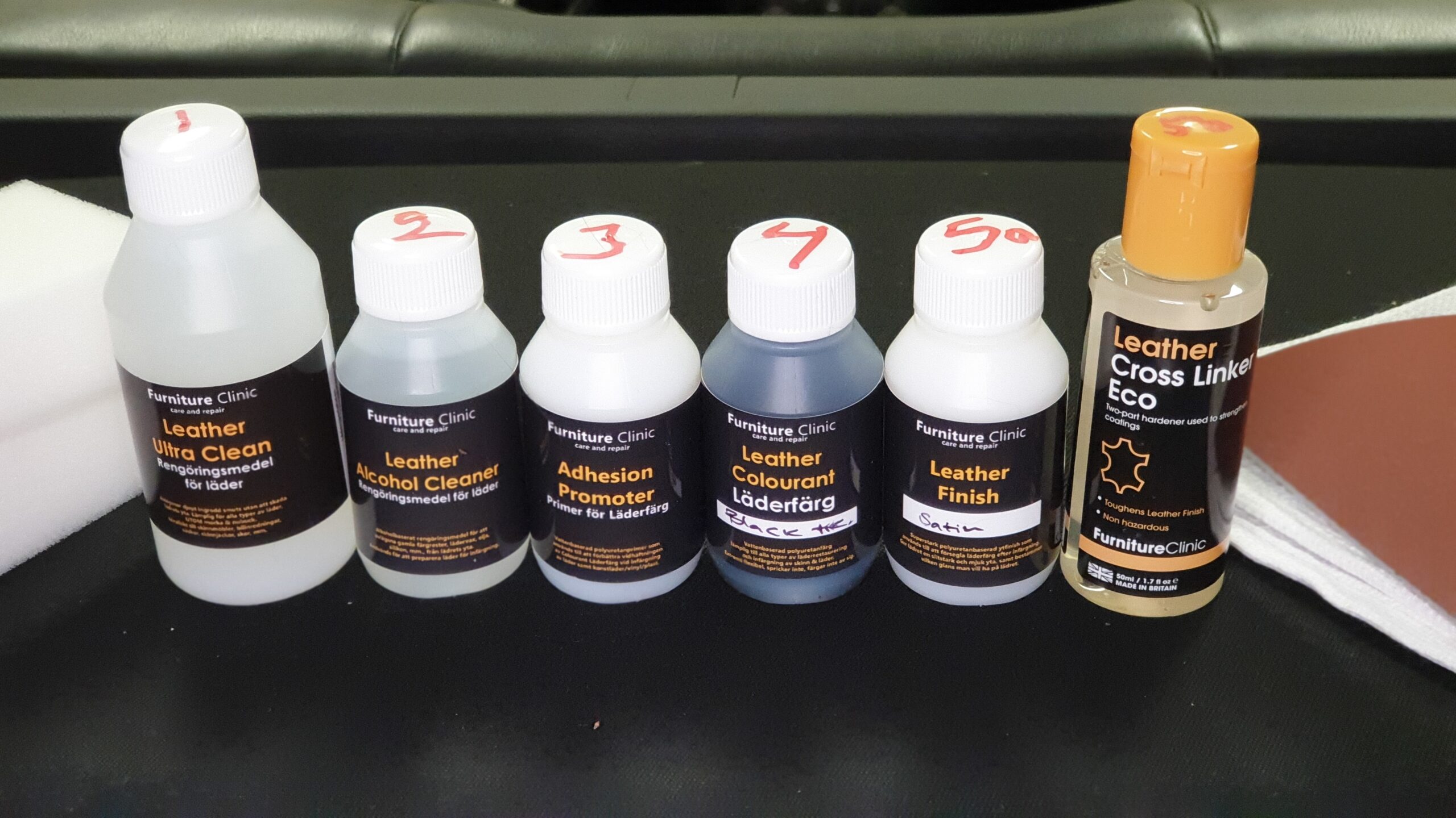 Därefter börjar arbetet med själva infärgningen. Först Adhesion promotor och sedan läderfärgen. Enklast är om du har en skumgummibit (tvättsvamp går bra) och duttar på färgen på ratten i flera lager. Var försiktig så färgen inte kommer på tråden runt ratten om den inte ska vara svart. Leather finish och som blir ett skyddande genomskinligt skikt. Har du fått luftbubblor kan du försiktigt slipa bort dem. Slutligen när allting torkat går du över lädret med sista flaskan – Leather cross linker.