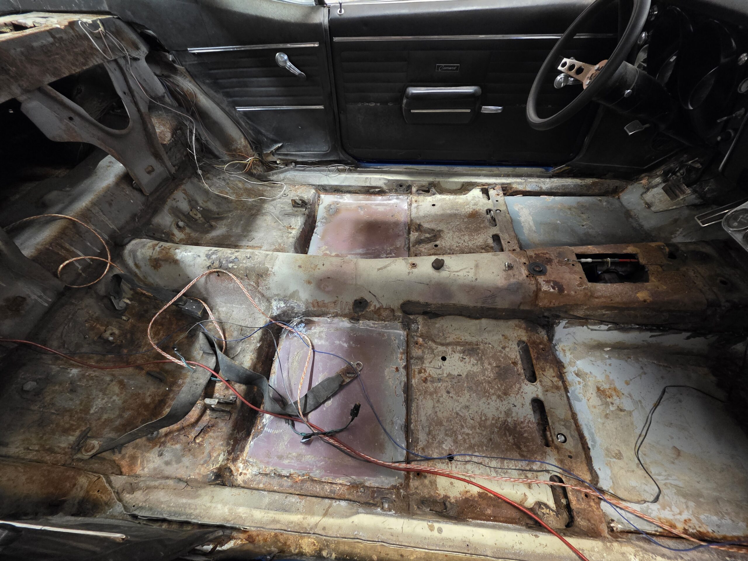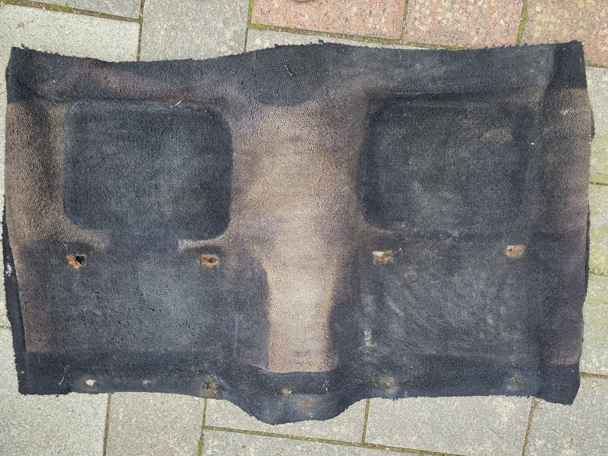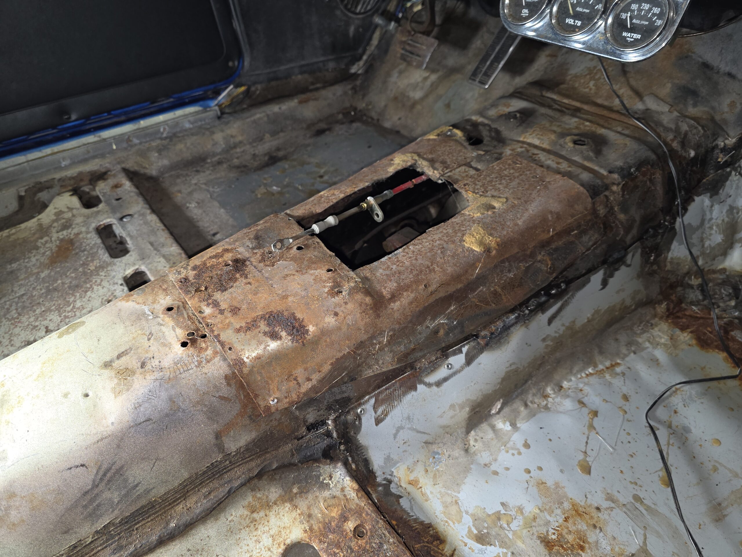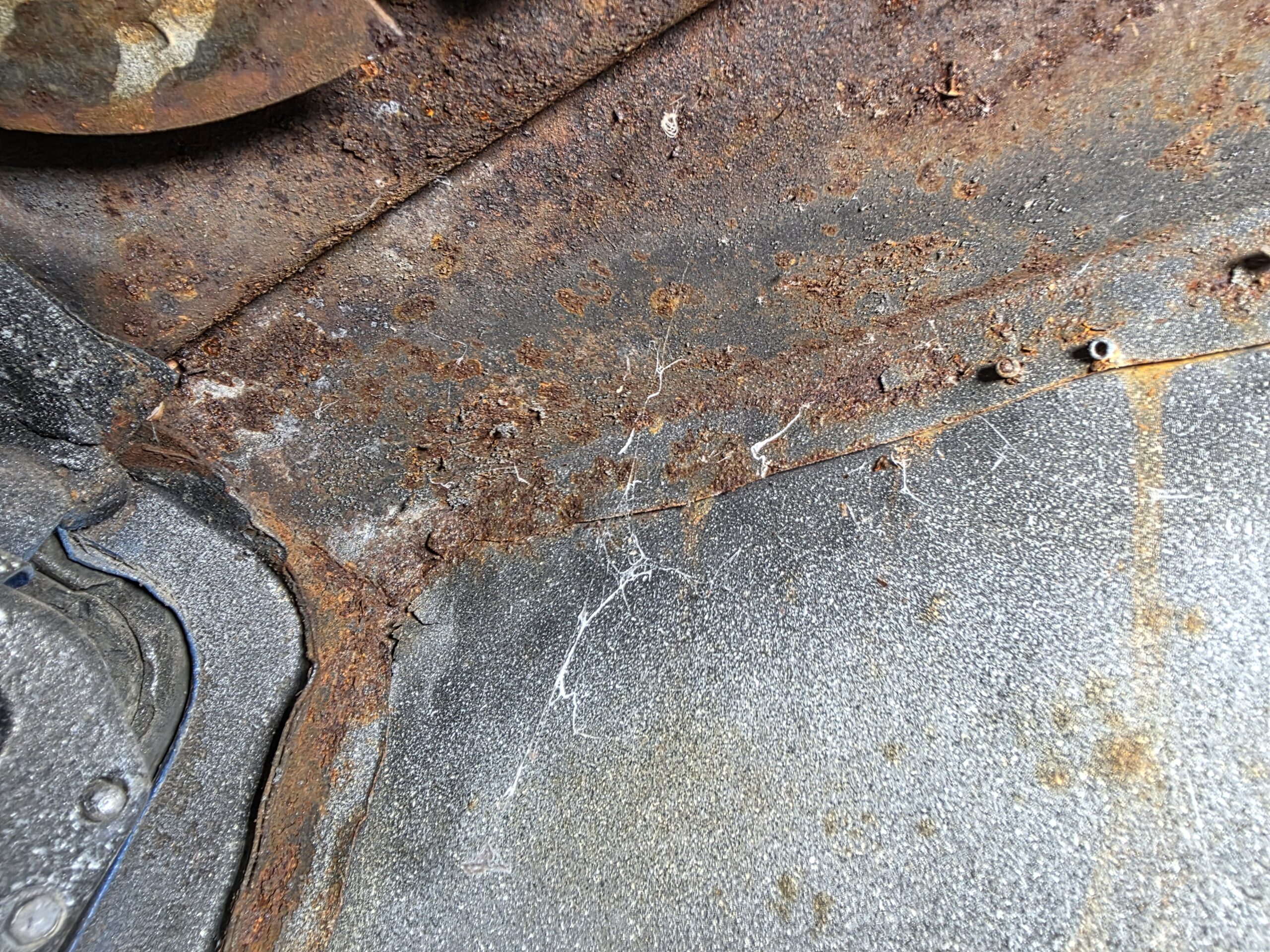 Här hade någon amerikan gjort mängder av fusklagningar. Vanlig plåt popnitad och några få svetsloppor på alla platserna vid fötterna samt kardantunnel. Även båda bakskärmarna hade byts genom att kapa av en skärmarna och popnita fast dem för att sedan lägga glasfiber över alla skarvar. Samma sak med golvet för de fyra fotplåtarna. Givetvis hade man inte heller kunnat låta bli bagagegolvet (som ofta rostar) och även här bytt ut stora delar av det och sedan popnitat. Blir till att byta den mesta karossplåten på hela bilen. Och då har jag inte börjat slipa ner lackeringen runt om, vilket säkert kommer att avslöja mer rost och fusklagningar.