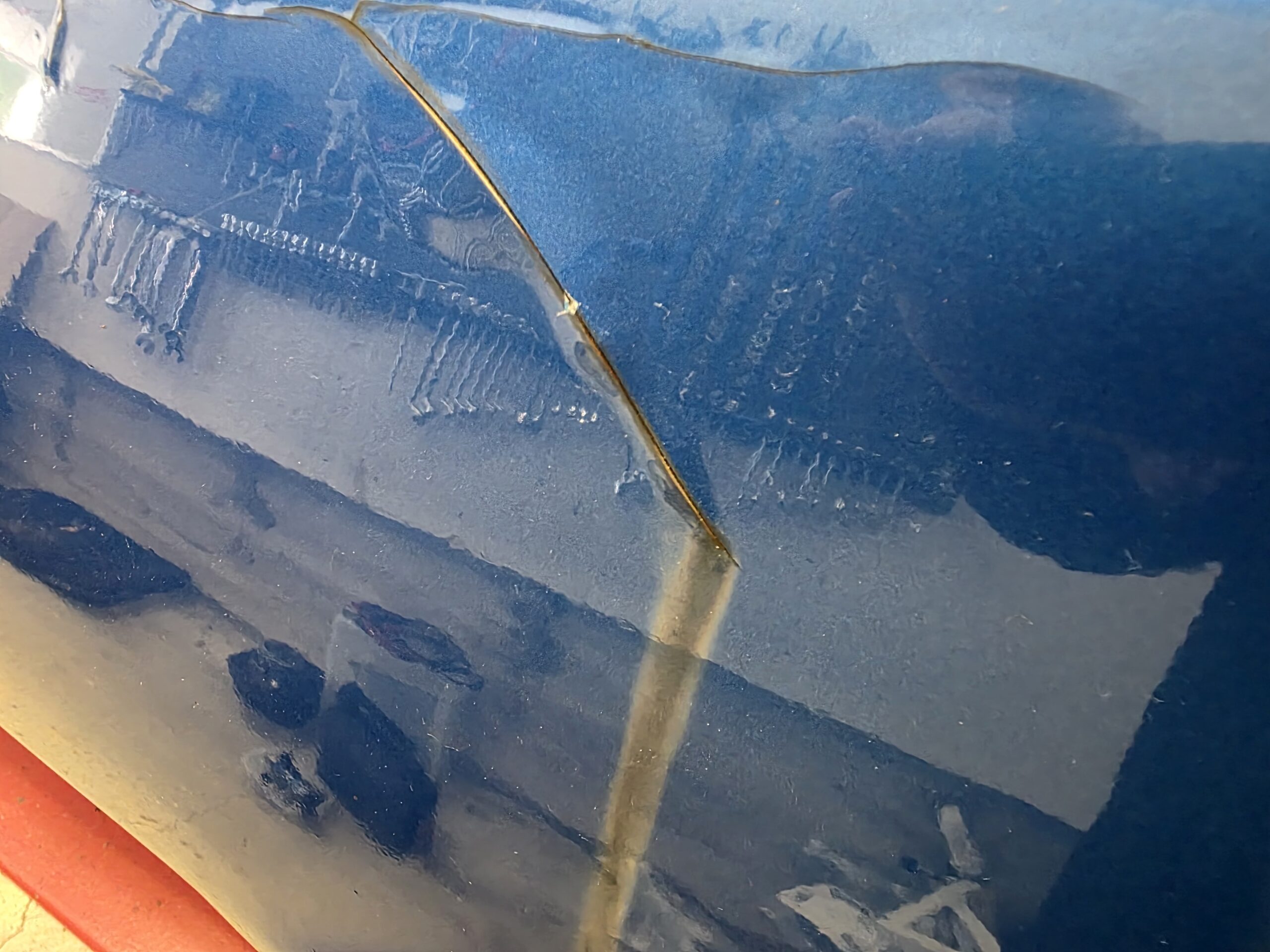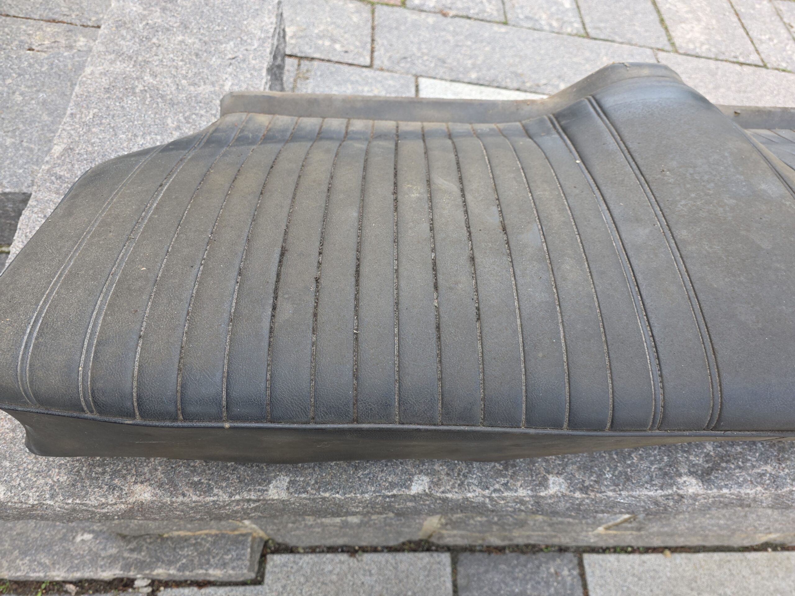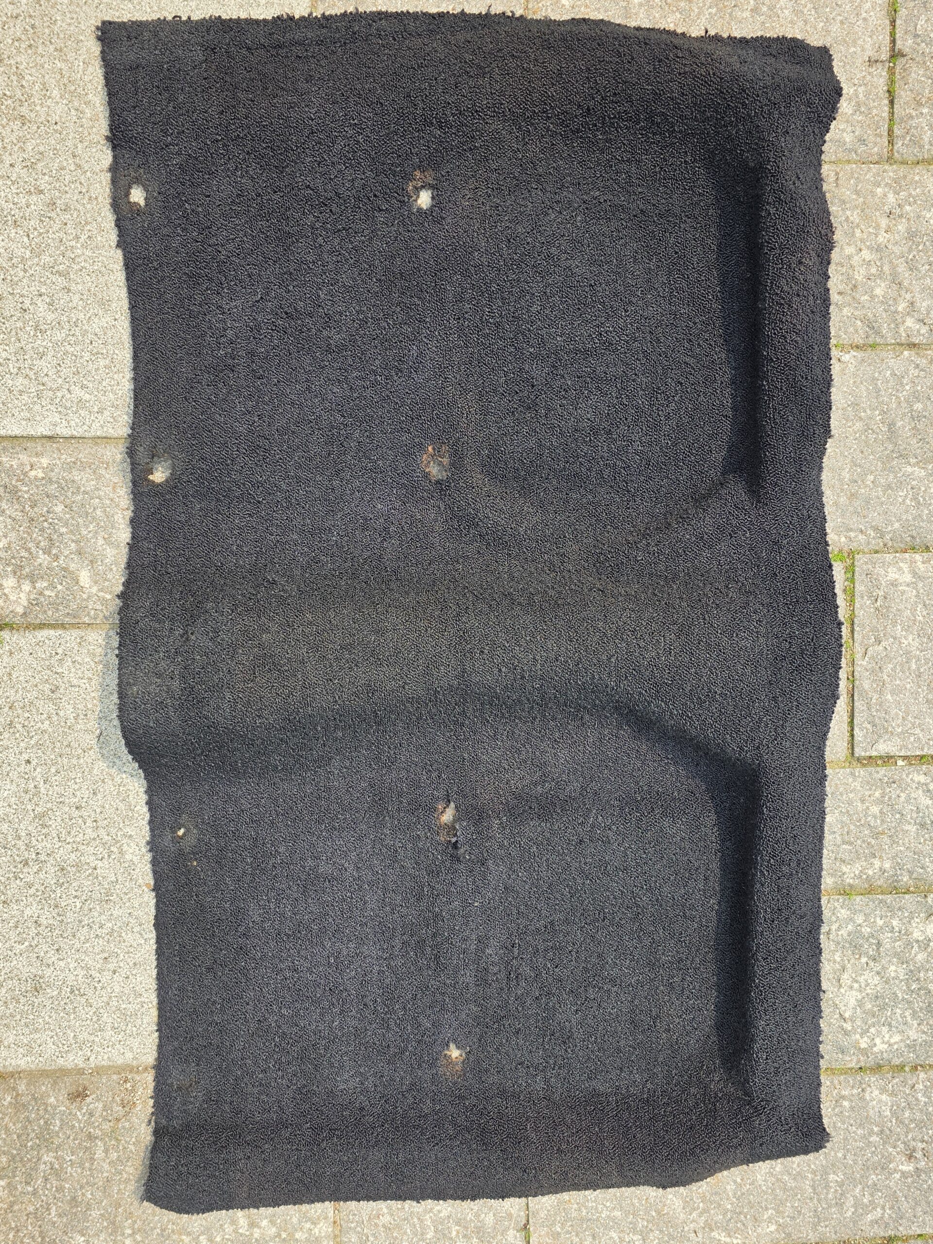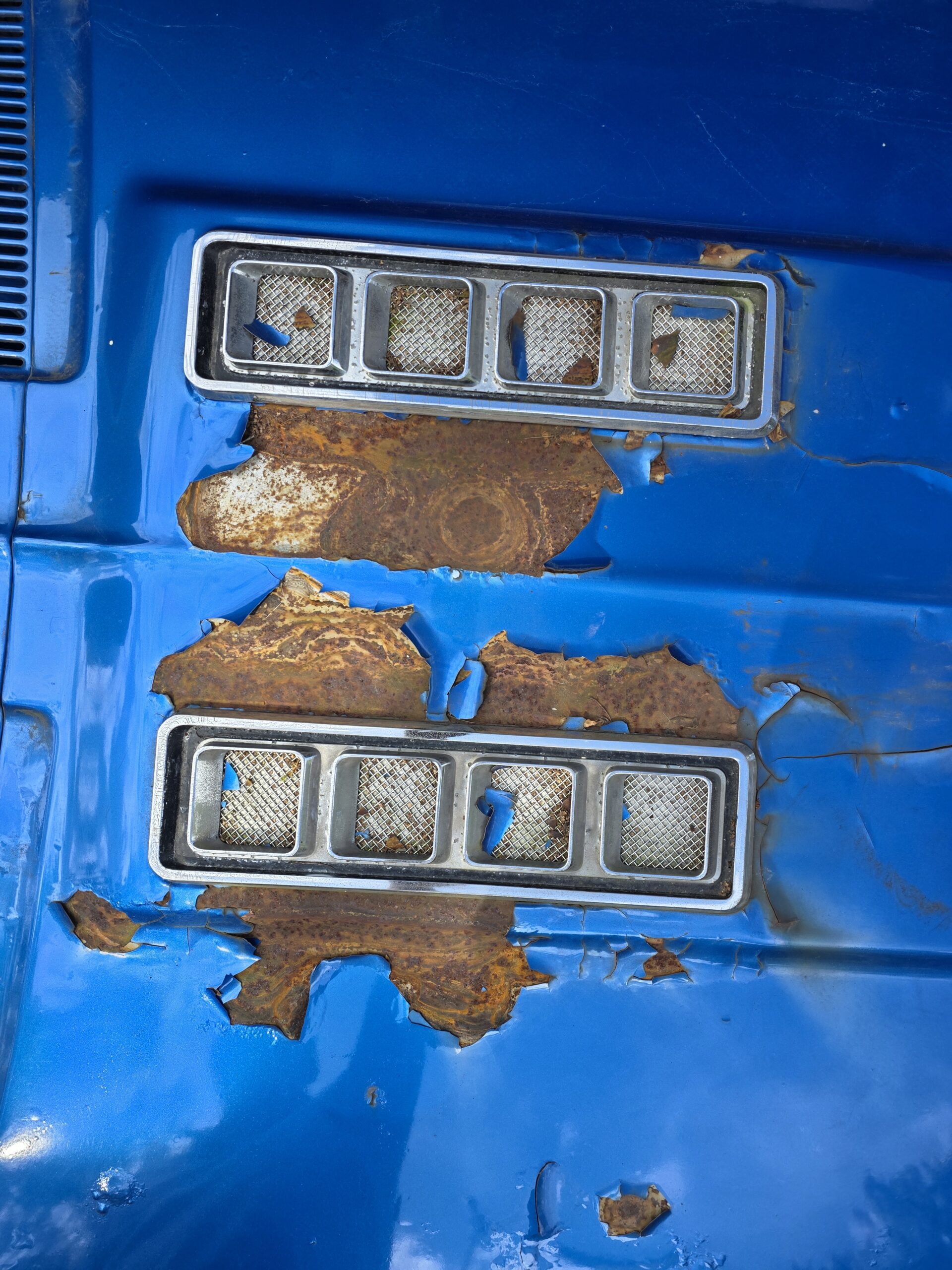 Här hade någon amerikan gjort mängder av fusklagningar. Vanlig plåt popnitad och några få svetsloppor på alla platserna vid fötterna samt kardantunnel. Även båda bakskärmarna hade byts genom att kapa av en skärmarna och popnita fast dem för att sedan lägga glasfiber över alla skarvar. Samma sak med golvet för de fyra fotplåtarna. Givetvis hade man inte heller kunnat låta bli bagagegolvet (som ofta rostar) och även här bytt ut stora delar av det och sedan popnitat. Blir till att byta den mesta karossplåten på hela bilen. Och då har jag inte börjat slipa ner lackeringen runt om, vilket säkert kommer att avslöja mer rost och fusklagningar.