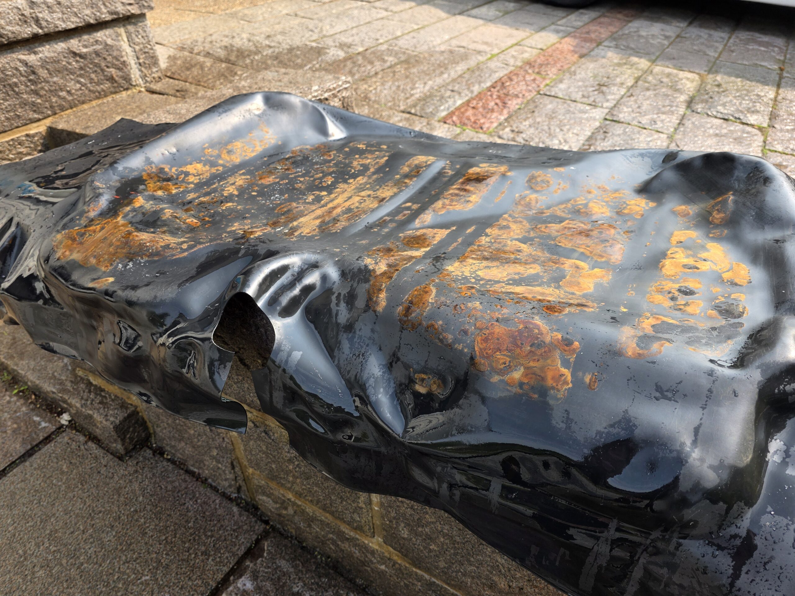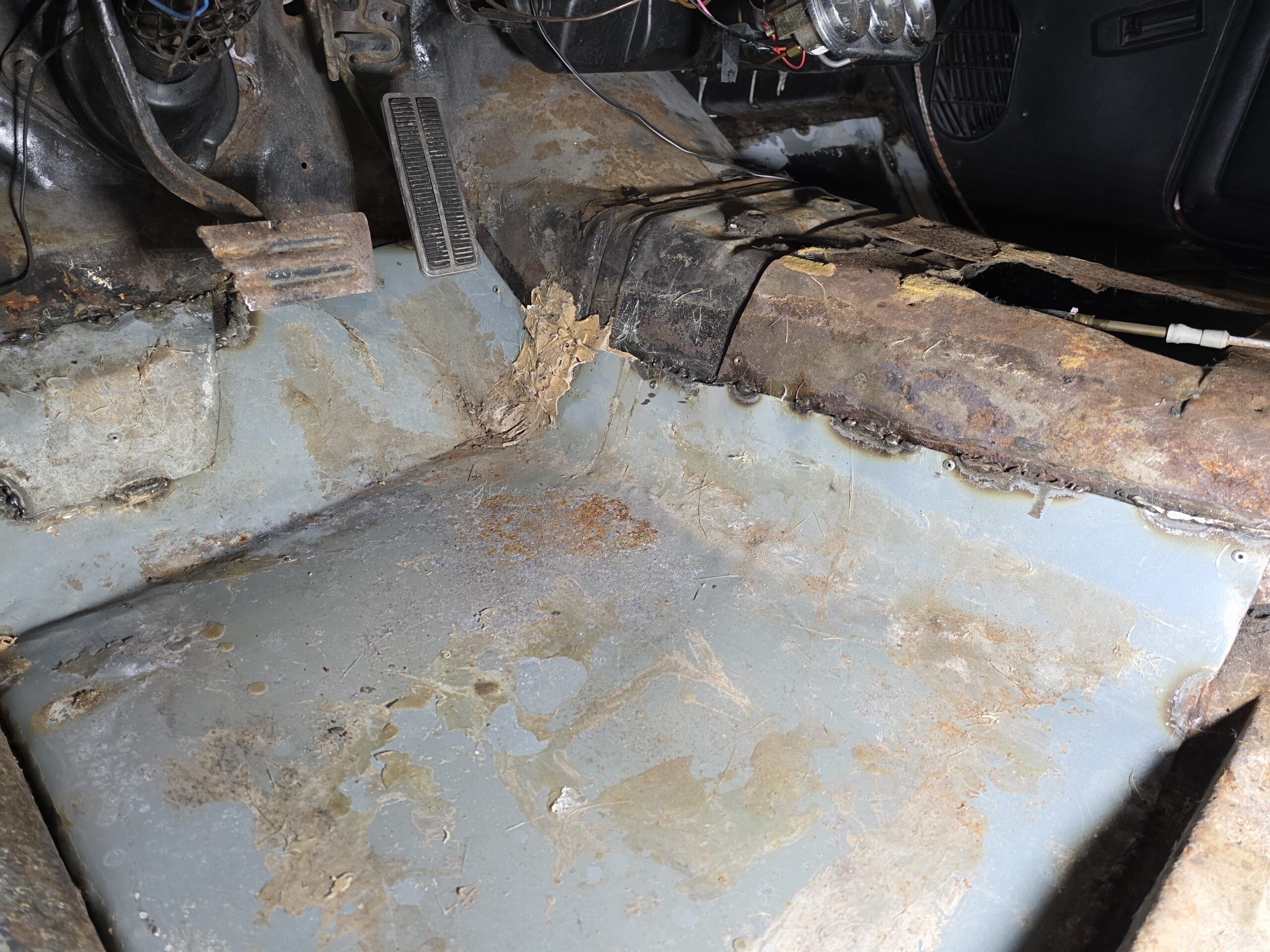 Bilen väl hemkommen och demonteringen kan börja. När muggiga inredningen väl var utplockad var det dags att inspektera plåten.