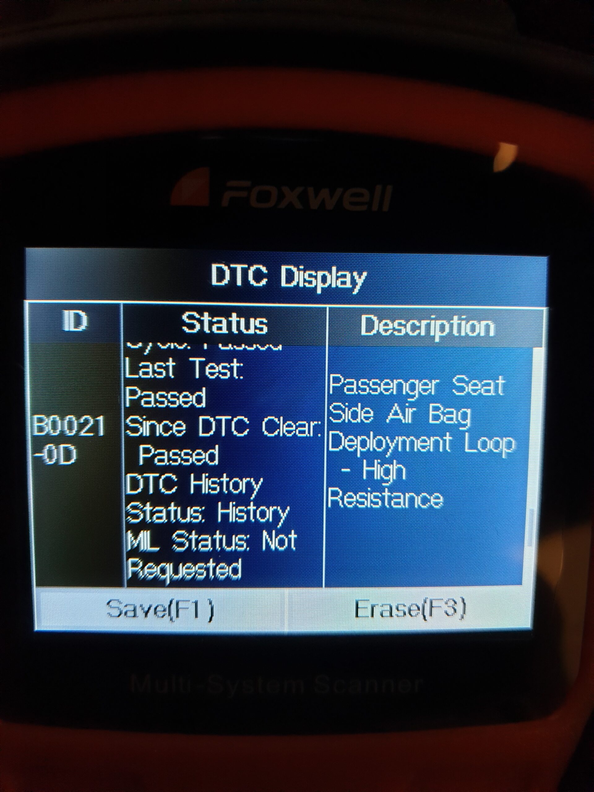 En OBD-skanner är ovärderlig hjälp när du renoverar modernare bilar, jag brukar använda en Foxwell NT520. Det var en hel del elfel på bilen. Största problemet var att air-bag-lampan inte slocknade. En första förhoppning var att det var fel på sensorerna i framstolarna. Efter att kontrollerat dessa och då speciellt sittdynans metalltrådar som känner av om någon sitter i stolen – och även bytt till nyare framstolar eftersom de gamla var slitna kunde jag konstatera att det inte var felet.