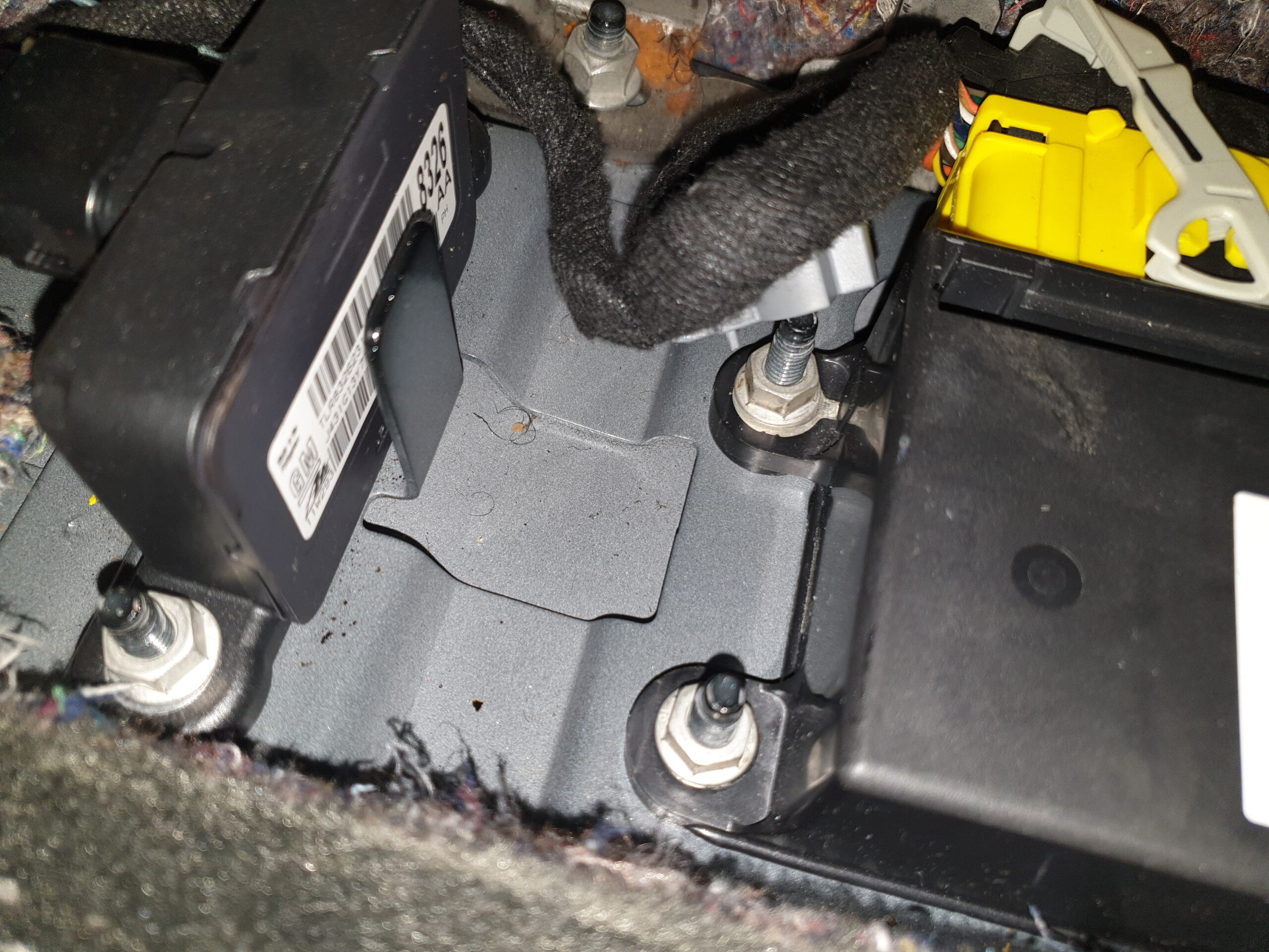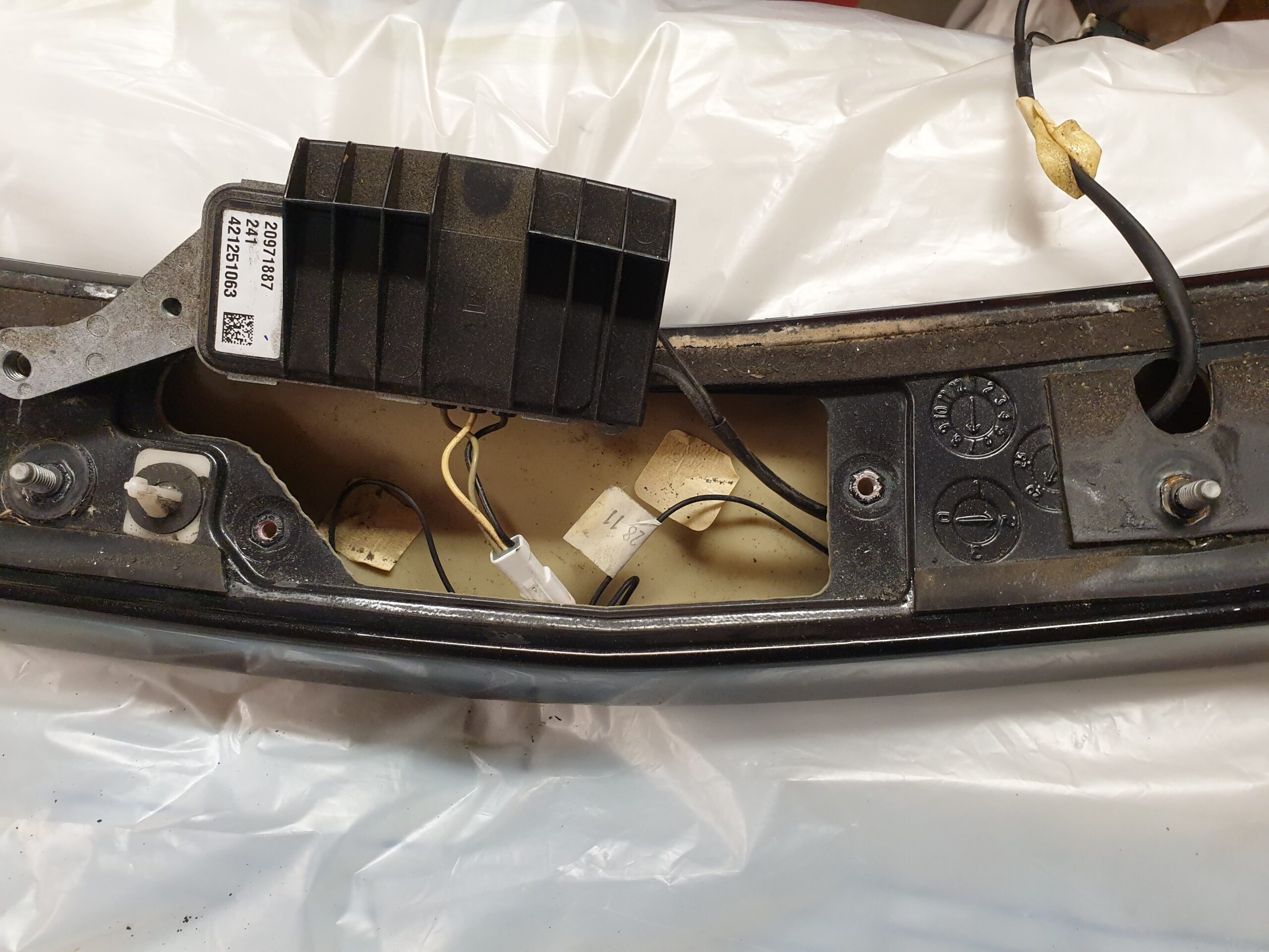 Via bagagerummet till bakluckan går en grov kabelstam till modul i spoilern och bakluckans lilla antenn. Med tiden är det vanligt att kablarna slits och går av på grund av att stammen kan ligga och skava mot karossen. Efter att fått felkoder i ODB-skannern för antennen till radion och att satellitfunktionen inte fungerade gick det att spåra till några brustna kablar i bagageluckans kabelstam. Även dåliga kontakter hittade i bakspoliern (bilden) där även en radiomodul finns. Snabbt åtgärdat och nu fungerar både radio och satellitfunktionen.