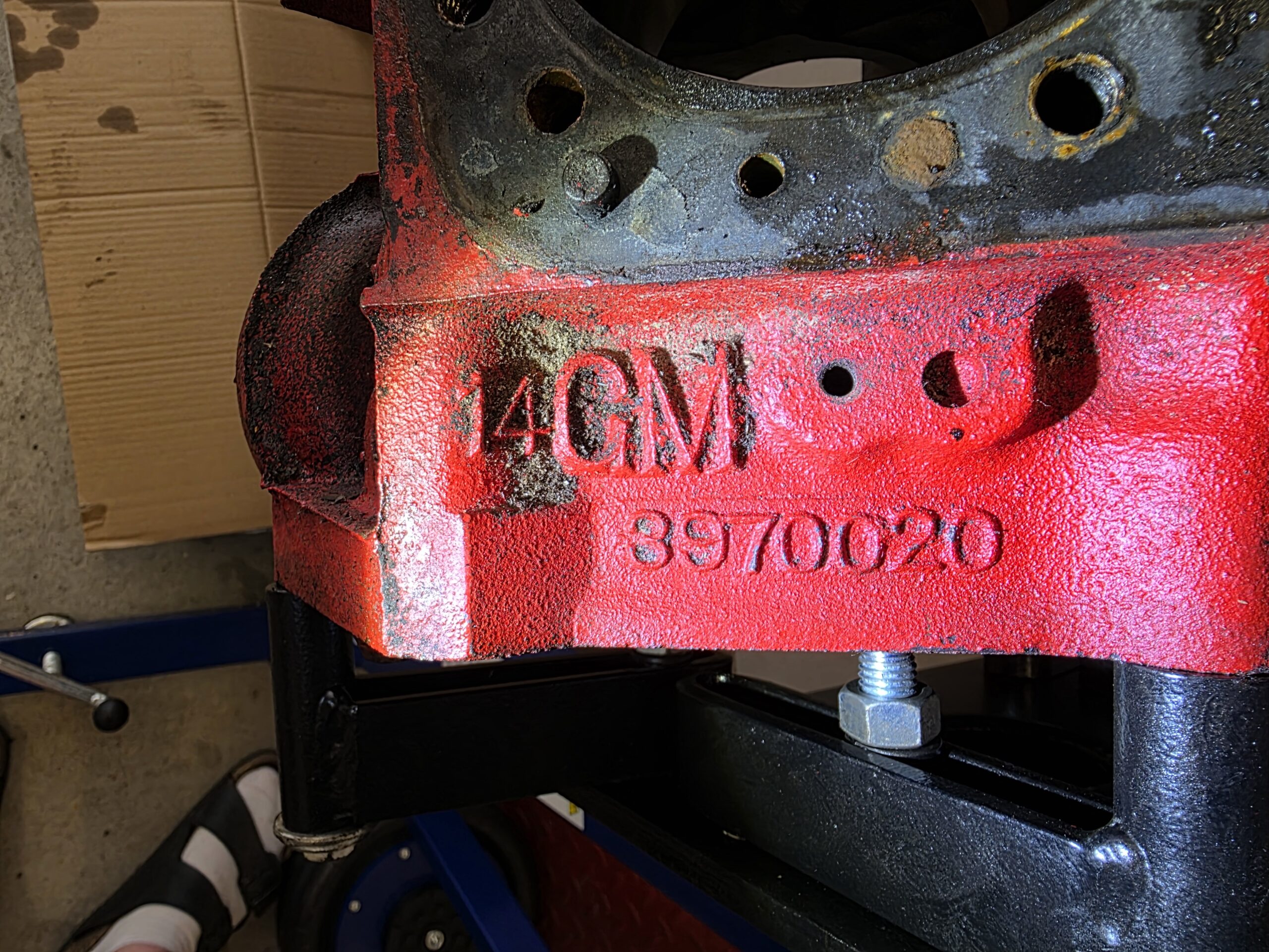 I närheten av gjutnumret finns ofta en liten kod med en bokstav och siffror (t.ex. E 18 71). Bokstaven anger månad (A=jan, B=feb osv.), följt av dag och årtal. Det hjälper till att fastställa exakt tillverkningsdatum. Numret på våra toppar är 14014416, det är ett GM casting number-format som börjar med ”14”. Det systemet började inte användas förrän i början av 1980-talet. På 1960- och 1970-talen användes fem- eller sju-siffriga nummer, t.ex. 3973487, 333882, 3998993 osv. Alltså kan ett gjutnummer på formen 140xxxx inte vara äldre än ca 1980.