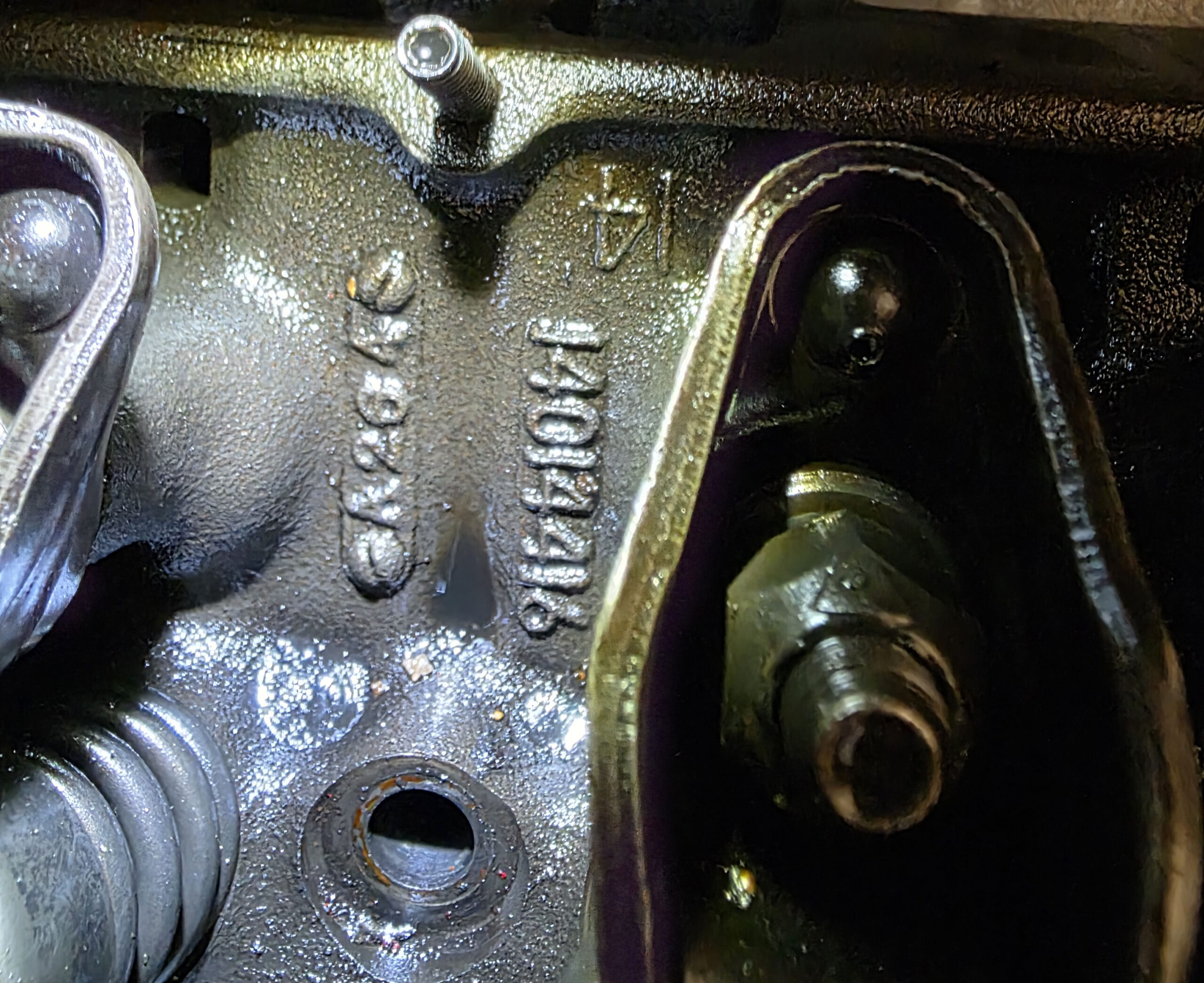 Innan vi grottar ner oss i motorns inre finns det en annan detalj som säger mycket om blockets kvalitet: de små gjutna siffrorna 010 (och ibland även 020) på blockets framkant. Om man tittar noggrant på blockets framdel, precis bakom kamkedjekåpan, syns ofta dessa siffror gjutna i blocket, i området kring kamaxelns centrumlinje. Dessa är inte del av motor- eller gjutnumret utan anger egenskaper hos själva gjutjärnet.