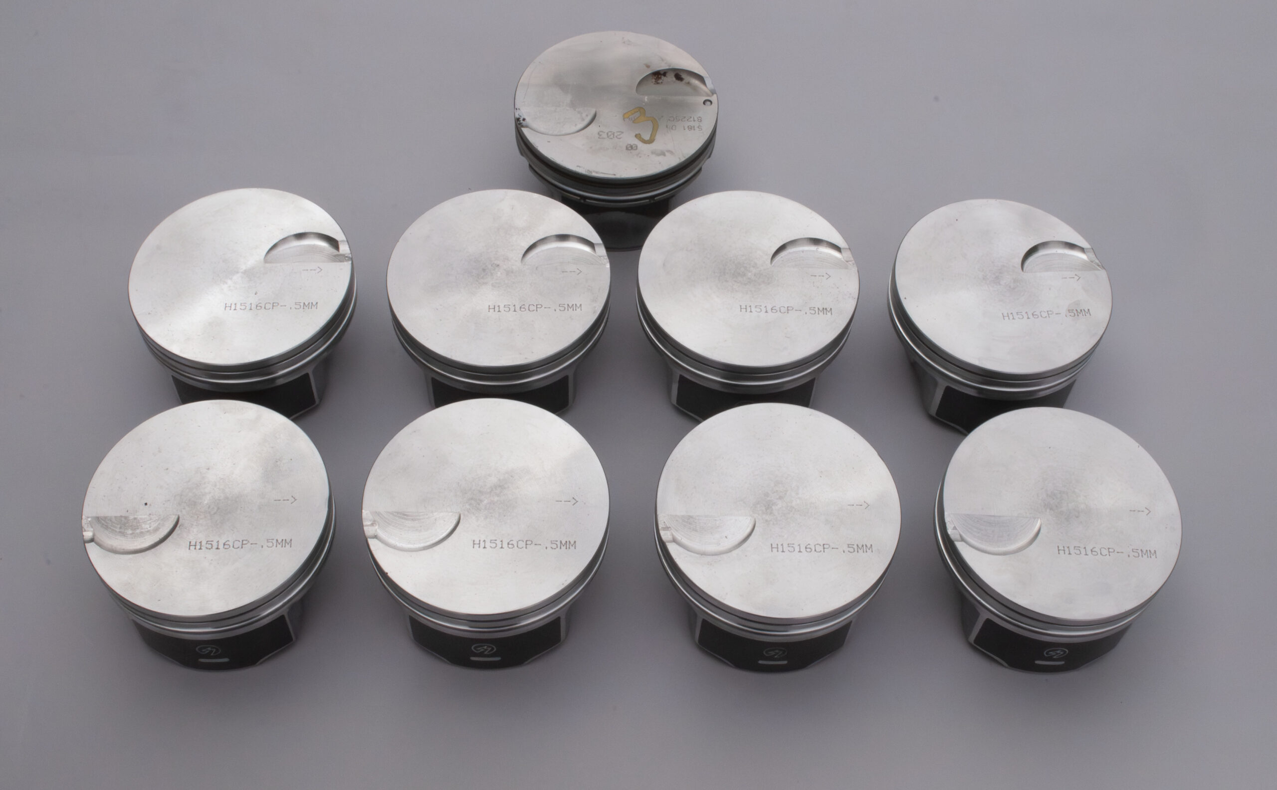 Nya Speed-Pro hypereutektiska kolvar till L99-motorn visade det sig bli svårt att få tag på eftersom det var mer än tre månaders väntetid. Därför beställde vi istället motsvarande dito för LS3-motorn, H1516CP med överborrning. Skillnaden mellan kolvarna är att L99 är urfrästa för ventilerna men inte till LS3. Därför fick en mekanisk verkstad anlitas för att fräsa ur ytan för ventilerna. Vi valde att bara fräsa ur en på varje kolv och på så sätt få något högre kompression på tre cc per kolv.