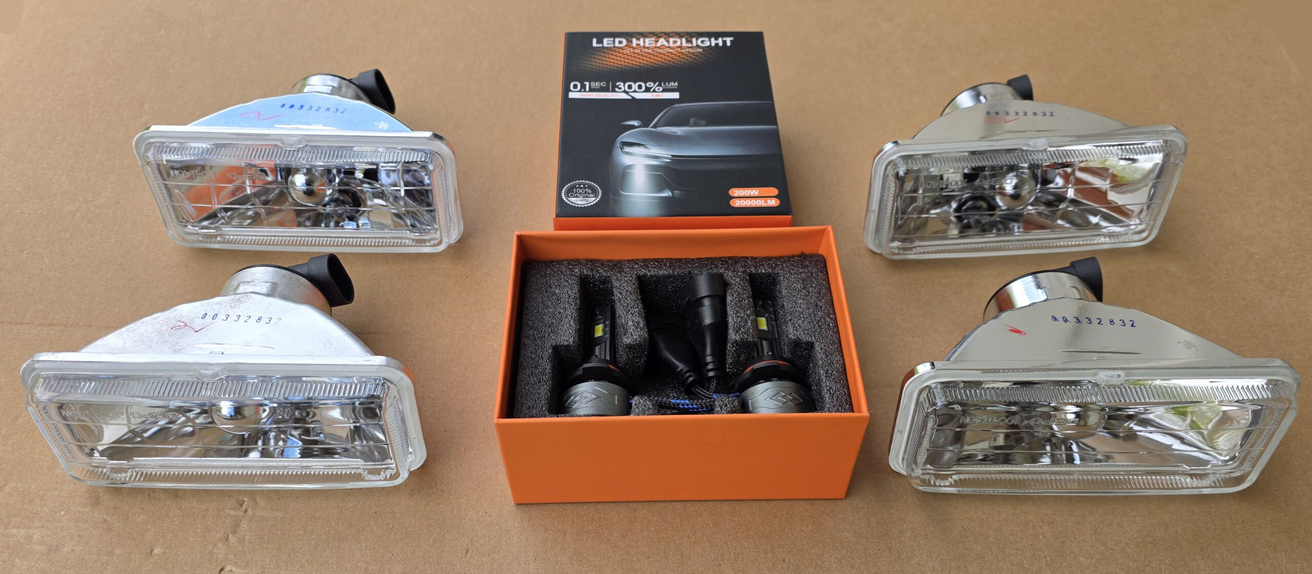 Även om det finns färdiga kitt att beställa finns det också en del fallgropar på vägen till upplysning. Det var min erfarenhet efter att ha beställt en uppsättning insatser och LED-lampor från Unique Style Racing i USA:. Kittet heter ”1993-1997 Chevy Chevrolet Camaro Euro Crystal Clear Headlight with Wiring + Halogen Bulbs” och jag la till White LED Bulbs i beställningen.