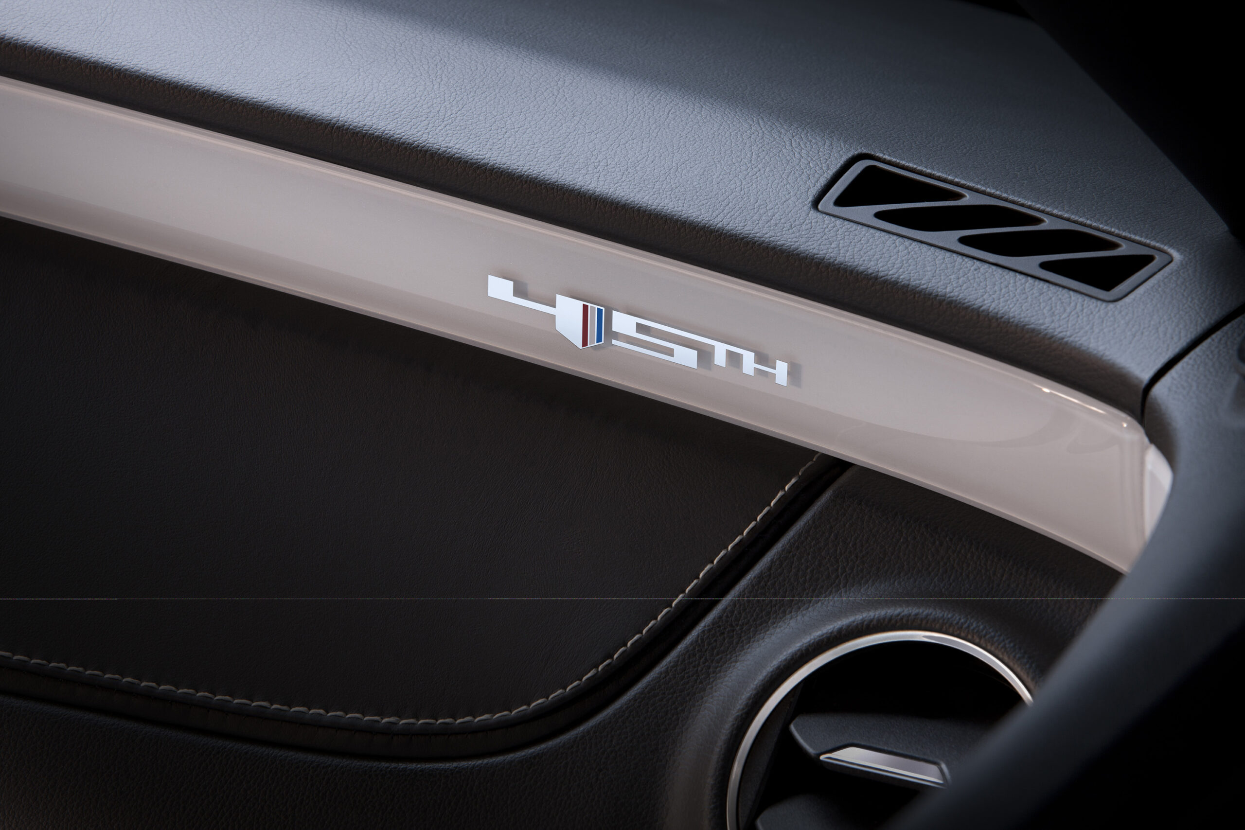 - Unik interiör: Svart läderklädsel med kontrastsömmar i rött, vitt och blått – en subtil nick till den amerikanska flaggan. Även ratten, växelspaken och sätena har 45th-broderier och detaljer som inte finns på vanliga SS-modeller.